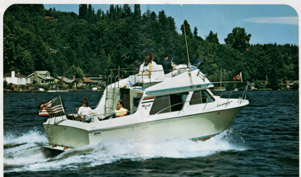 1970 – The last wooden hull boat was built. The very successful 34′ Sedan was the first “keel up” fiberglass design, which sold 194 units in 11 years, and set the Tollycraft design trend for the 1970s.